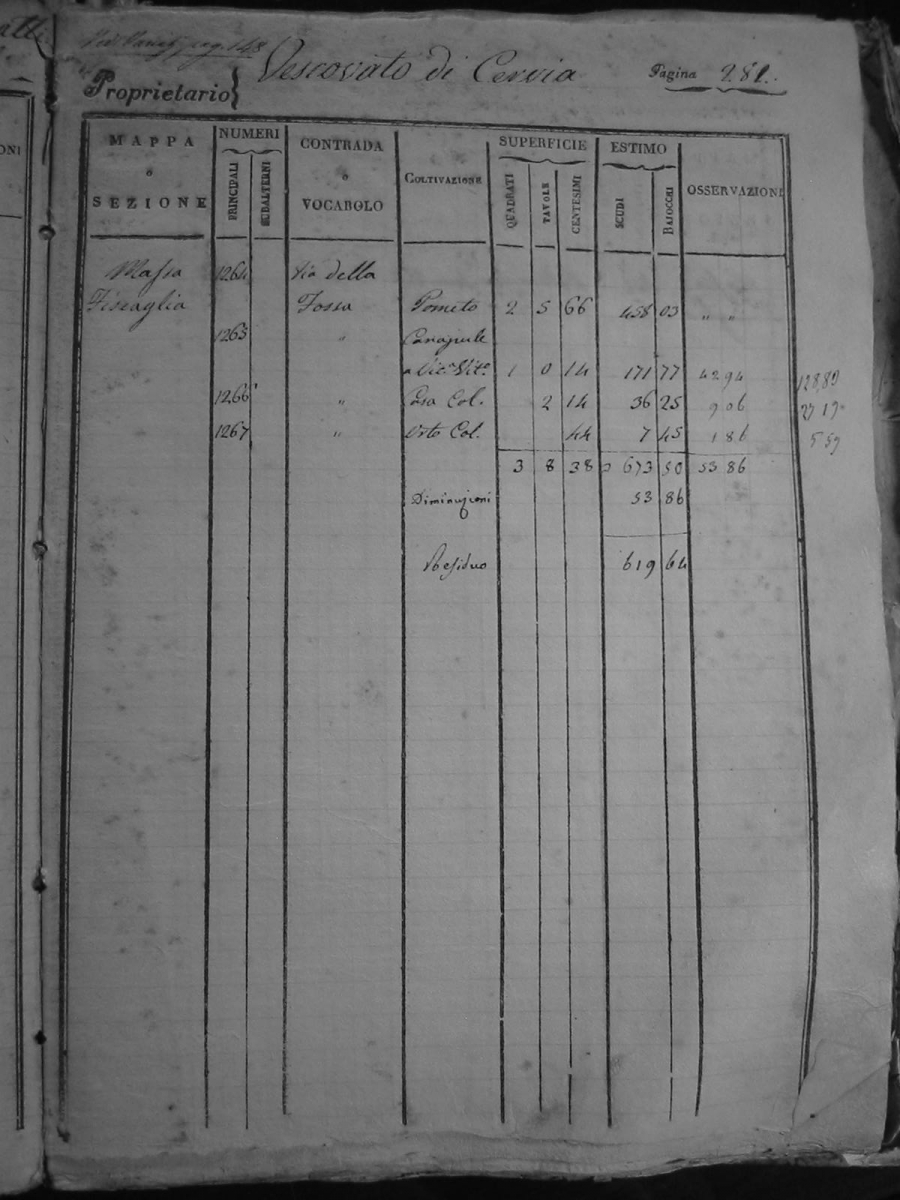 Nei lunghi anni che trascorsero prima dell’attivazione del Catasto Gregoriano, a fini fiscali l’unico documento utilizzabile rimase perciò il cosiddetto Catasto Carafa, sui cui registri venivano registrate anche le volture. Il limite più evidente di questo strumento era la stima dei terreni circoscritta a poche generiche categorie fiscali, sulla base dell’utilità conseguibile con le opere di bonifica e scolo. I terreni erano infatti classificati in arativi abbragliati (cioè arborati e vitati), campagnoli (arativi nudi), prativi, pascolivi e sabbionivi. Il secondo grave limite del documento fiscale è che escludeva dalla registrazione vasti possedimenti degli esenti o privilegiati. Per citare un esempio, dall’elenco dei possessori contribuenti nei villaggi del Polesine di Casaglia mancava proprio la villa di Casaglia, situata al centro di una grande tenuta di oltre 1.000 ettari esentata dalla tassa sui lavorieri in quanto appartenente alla grande famiglia dei Pio di Savoia.