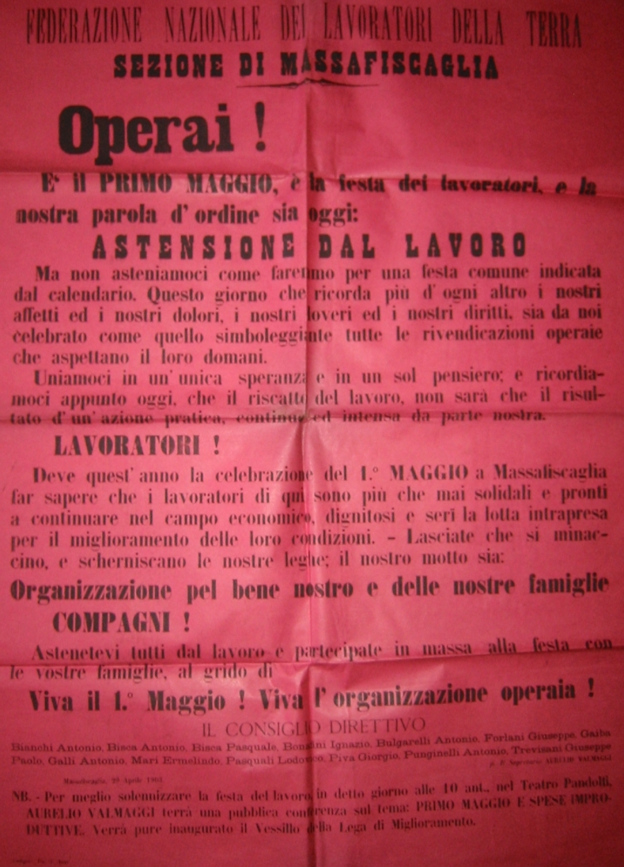 Le campagne ferraresi tornarono ad essere uno dei centri della conflittualità sociale in Italia nel corso del 1911, quando scioperarono 98.000 fra avventizi, obbligati e boari. A febbraio si riempirono le piazze delle cittadine della provincia con la richiesta di lavori pubblici, mentre alla mietitura l’obiettivo del collocamento di classe spinse allo sciopero i lavoratori agricoli dell’intera provincia, che tornarono ad incrociare le braccia ancora nell’autunno a fronte dell’arroccamento dell’agraria: alla fine il “lodo Taddei” prefettizio concesse sostanziosi aumenti salariali, ridusse l’orario degli obbligati e introdusse commissioni arbitrali, mentre la questione del collocamento restò in sospeso. La tensione rimase alta nei due anni successivi, quando incrociarono le braccia 16.000 e poi 38.000 lavoratori delle campagne. Nel 1913 gli scioperanti ferraresi costituirono la metà di quelli dell’Italia intera: a Massafiscaglia si aprì una durissima vertenza attorno all’istituzione di un ufficio di collocamento, durata otto mesi e condotta da entrambe le parti con estrema determinazione. La sconfitta dello sciopero generale di solidarietà, l’intervento di crumiri e i primi cedimenti di gruppi di lavoratori estenuati sancirono la fine dell’egemonia sindacal-rivoluzionaria, ma consegnarono questioni aperte e rivendicazioni al dopoguerra.