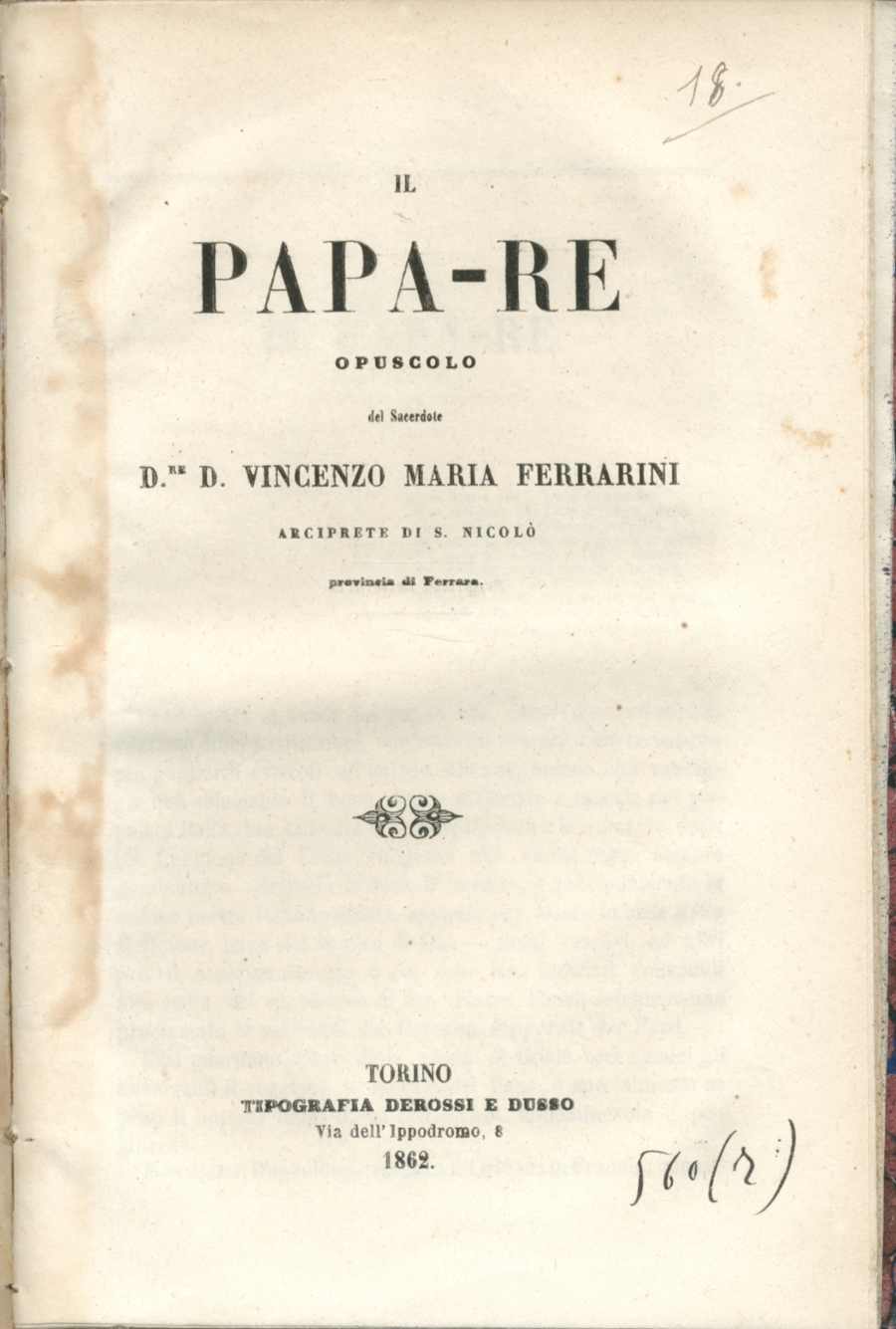 A fronte della «sostanziale e intransigente compattezza del clero ferrarese» (Samaritani), non mancarono i sacerdoti di sentimenti liberali che plaudettero all’unificazione politica della penisola, auspicando una conciliazione tra Stato e Chiesa. Tra questi don Vincenzo Maria Ferrarini, parroco di San Nicolò d’Argenta, autore nel 1862 di un opuscolo intitolato Il Papa-Re, in cui sosteneva che il pontefice avrebbe dovuto deporre la «temporale dominazione» e «non contrastare i progressi della società». È probabile che anche il parroco di Serravalle, don Angelo Melandri, consentisse con le istituzioni liberali, se è vero che nel 1862 condusse tutti i suoi parrocchiani a votare. Analoghi sentimenti nutrivano don Eugenio Rinaldi, don Cleto Gasperini, don Felice Magnani, don Luigi Zerbinati e don Bartolomeo Ballerini, i quali, a dispetto delle prescrizioni della Santa Sede, presero parte nel 1861 alla Festa dello Statuto. L’anno successivo don Eugenio Rinaldi avrebbe sottoscritto la petizione promossa da padre Carlo Passaglia affinché il papa rinunciasse al potere temporale. Don Rinaldi, don Gasperini, don Magnani, don Zerbinati e don Ballerini erano tutti insegnanti del liceo-ginnasio cittadino e tutti, ciò che è assai significativo, non ferraresi d’origine.