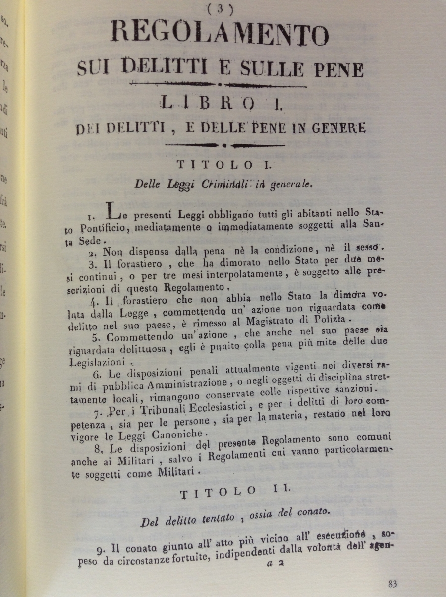 Le risposte legislative a questo stato di cose, arrivate solo dopo diversi progetti di codificazione falliti, si ebbero a seguito dei moti del ’31: il Regolamento sui delitti e sulle pene e il Regolamento organico e di procedura criminale, entrati in vigore nel 1832. Papa Gregorio XVI intensificò anche le disposizioni sulla polizia, ma per un vero regolamento in questo settore si dovrà aspettare il 1850, a seguito dei moti del ’48. Nonostante fossero di discreta fattura, i Regolamenti penali del ’32 si ispiravano a un sistema repressivo inasprito, che affrontava in maniera esemplare i turbamenti più temuti alla pace sociale. La “morte esemplare” colpiva chi compisse alcuni crimini contro la religione, i delitti di lesa maestà, l’omicidio commesso per causa di furto. Quest’ultimo fenomeno, ad esempio, aveva assunto proporzioni preoccupanti anche nel Ferrarese, infestato da bande di malfattori attivi nelle campagne: tra il ’50 e il ’51 una banda guidata da Stefano Pelloni (detto “il Passatore”) seminò il terrore, giungendo a invadere il paese di Consandolo e a uccidere un medico; qualcosa di analogo accadde anche nel 1858. Sempre a partire dal pontificato di Gregorio XVI si intensificarono le misure contro accattoni, oziosi e vagabondi; vennero controllati anche i forestieri e gli spostamenti degli stessi cittadini, sulla base di una politica criminale basata sul puro sospetto. Il Regolamento di procedura sanciva formalmente la separazione fra i poteri, togliendo al delegato pontificio la presidenza del tribunale criminale; ma, d’altro canto, prevedeva un processo di tipo inquisitorio poco garantista, con possibilità di appello per le sole sentenze di condanna a morte.